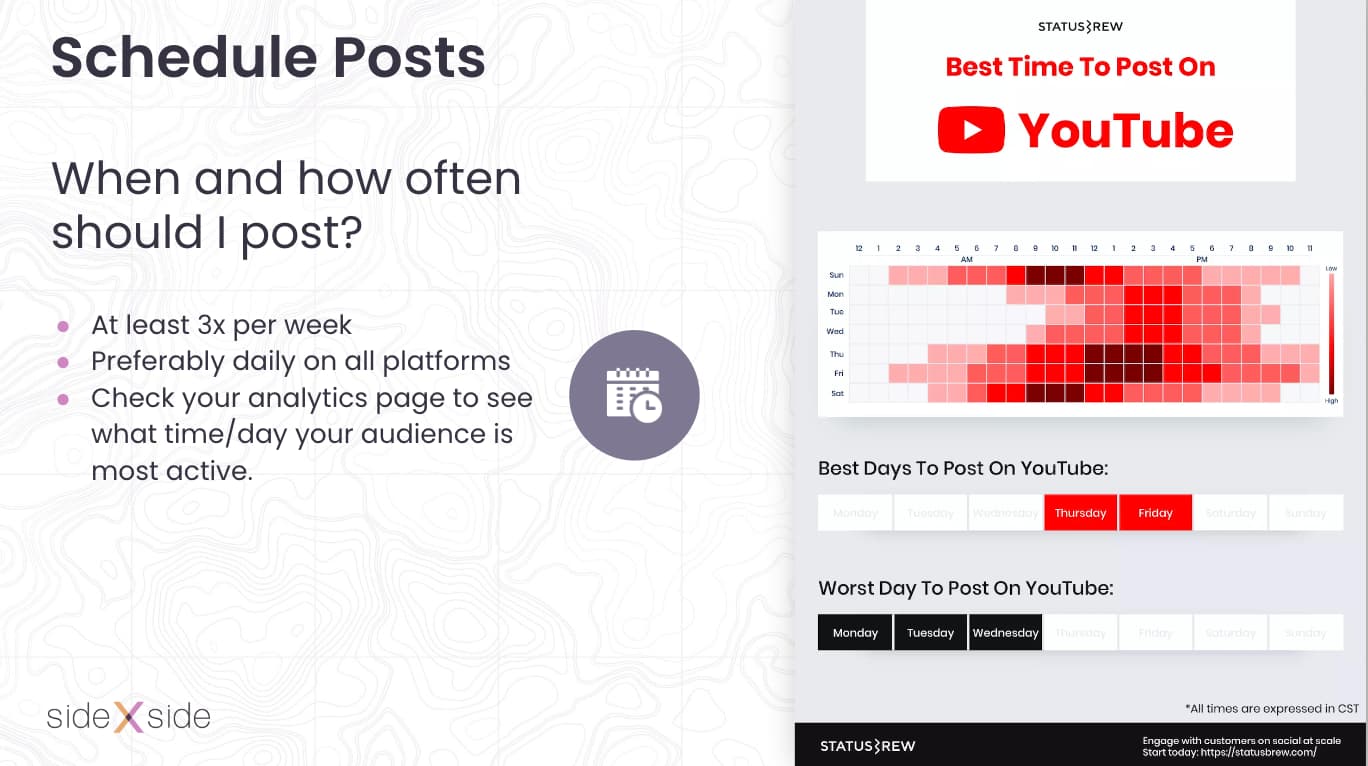 Everyone has a different opinion on how frequently you should be posting. Tiffany’s personal preference is at least three days a week, ideally closer to once a day on each channel.