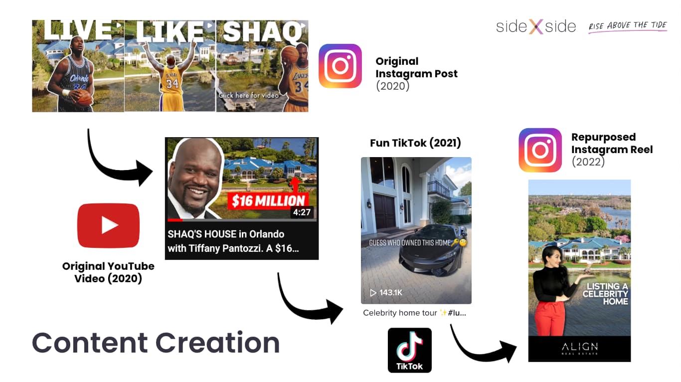Tiffany has six buckets for her social channels: Business, proof of success, educate, inspire, entertain, and lifestyle. “In my business bucket, I could be posting about new listings, luxury tours, new developments, and open houses. In my lifestyle bucket, I could be posting about my family, my friends, client interactions, and local hotspots. There are so many ways you can fill these buckets and create new content that’s fresh and exciting.”
