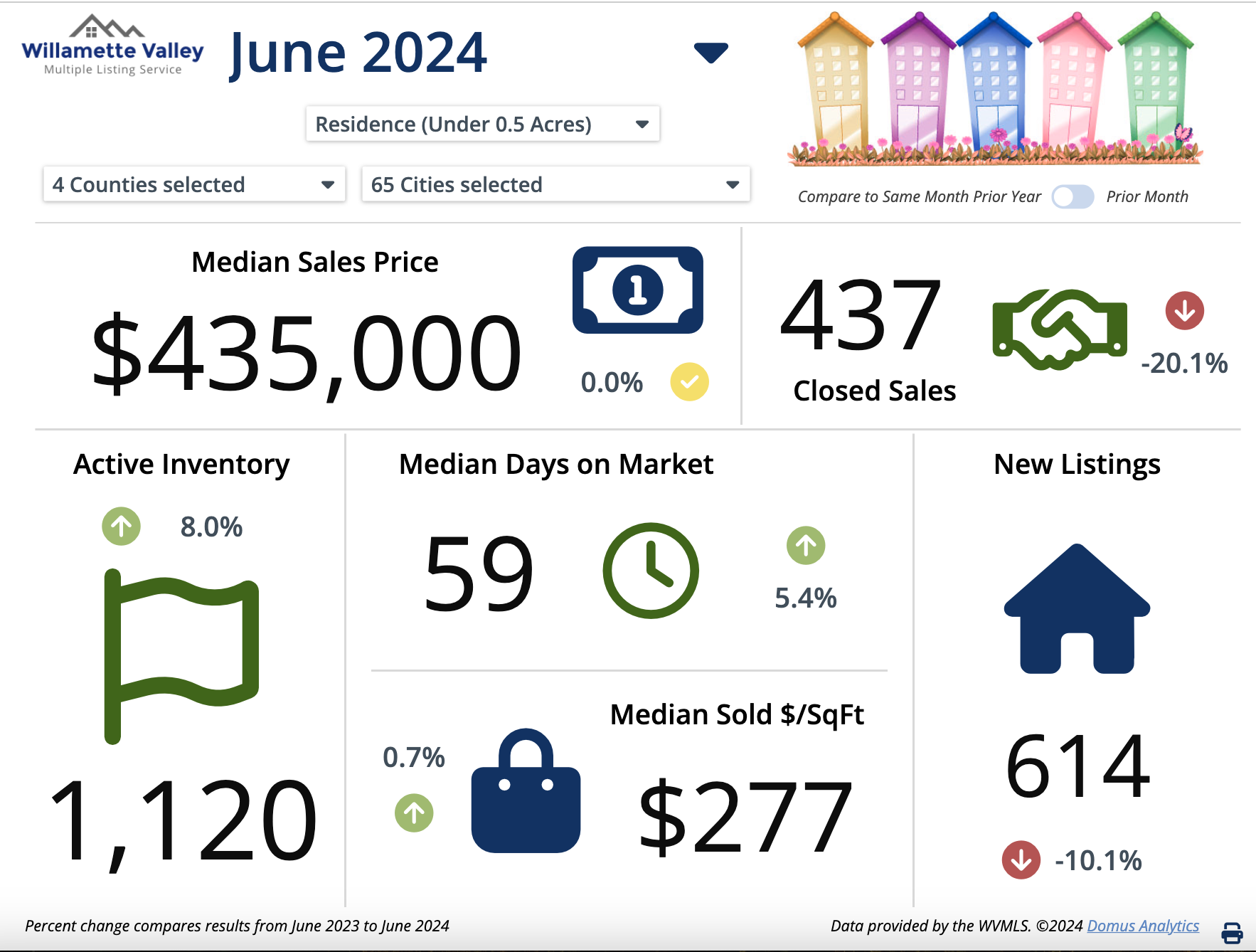 The Willamette Valley saw new listings decrease by 10.1% in June, with the median days on market increasing by 5.4%. However the median sales price is hovering right around $435,000.
