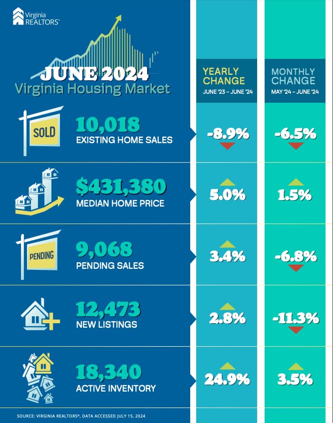 Despite a recent month-over-month decline, overall sales activity in Virginia for the first half of this year is slightly outpacing the same period in 2023. This increase in sales has occurred even with higher mortgage rates compared to the first half of last year.
