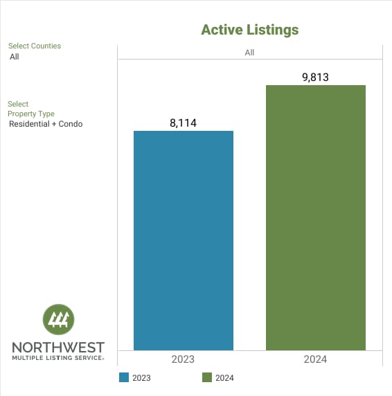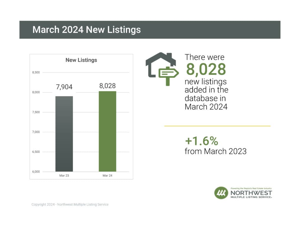There were 8,100 active listings on the market at the end of March 2024, a slight increase of 1.2%, when compared to March 2023 (8,007). NWMLS brokers added 8,028 new listings to the database in March 2024, a slight increase of 1.6% compared to March 2023, when 7,904 new listings were added.