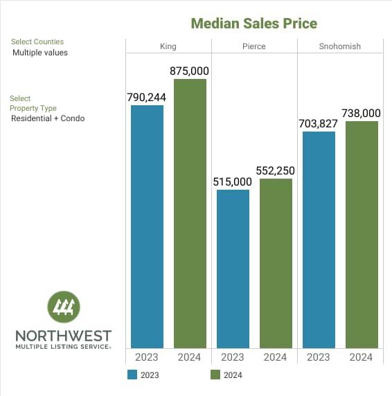 Overall, the median price for residential homes and condominiums sold in March 2024 was $633,717, up 7.4% when compared to March 2023 ($590,000). The median sales price increased year over year in 19 of the 26 counties, with the highest median sales prices in King ($850,000), San Juan ($750,000), and Snohomish ($730,000) counties. The three counties with the lowest median priced homes sold were Pacific ($347,500), Grant ($325,000), and Columbia ($274,000).